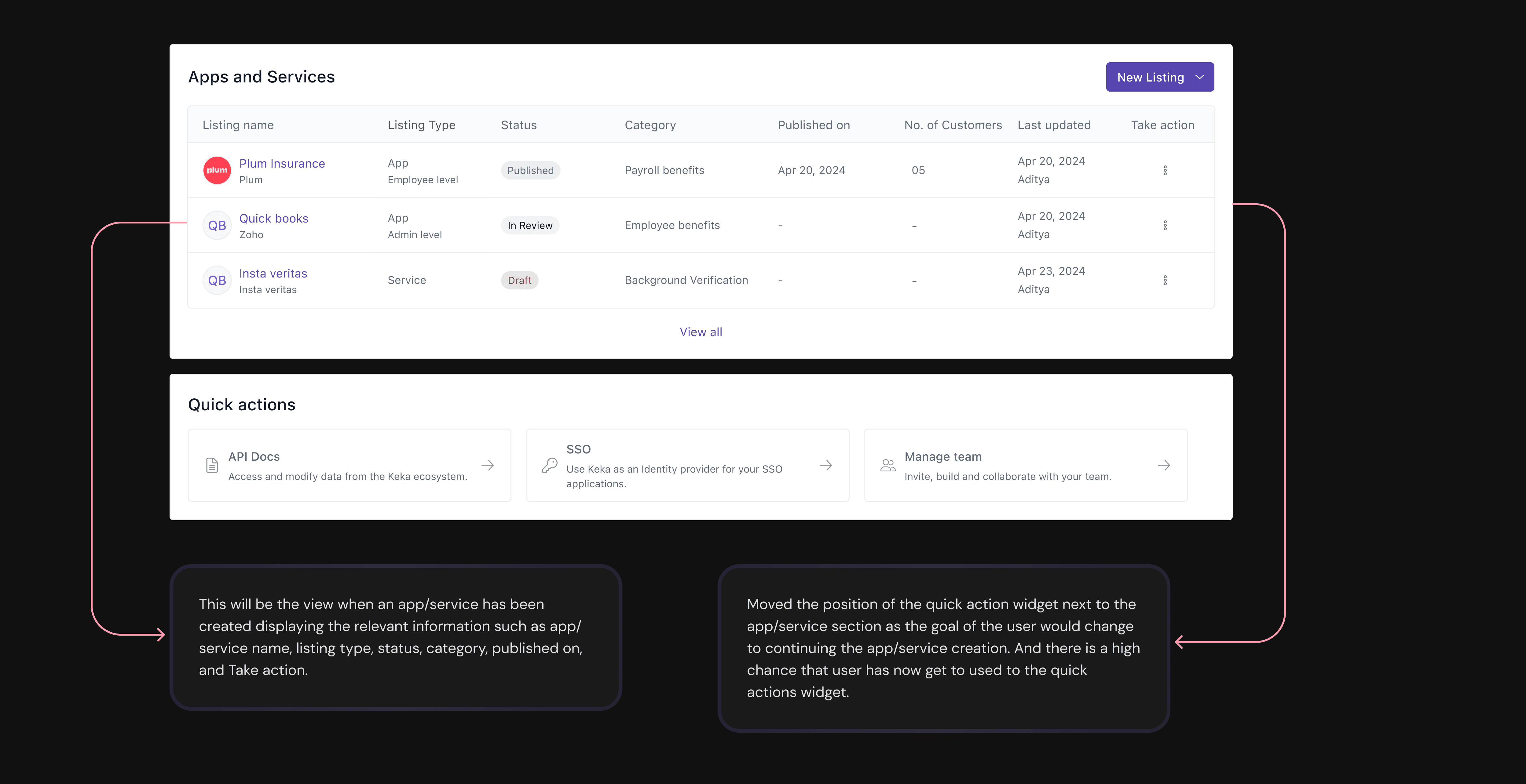 The current App Portal lacks a user-friendly home page that clearly explains the process of creating apps and listing services. Users are often confused about the difference between Services and App Listings, as this has not been properly addressed. Important technical details, such as how to use Keka APIs and manage the sandbox environment, are missing or difficult to find. Without proper guidance, users may struggle to start, navigate, and complete the steps needed to create and publish their apps or services. Additionally, there is a need to offer a personalized home page experience based on different user roles or personas to better guide them through the process.